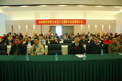 11月4日下午,中国科学院苏州纳米技术与纳米仿生研究所党总支组织召开全体党员会议,学习传达十七届四中全会精神和中共中国科学院党组关于学习贯彻十七届四中全会精神相关文件。研究所全体党员参加会议,会议由总支书记刘佩华主持。